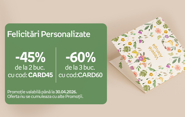 În magazinul online Empik Foto veți găsi o gamă largă de felicitari personalizate cu poza si nume, pe care le puteți personaliza după cum doriți. Special pentru dumneavoastră, am pregătit idei interesante de felicitări personalizate pentru ziua de naștere, precum și propuneri de felicitări pentru alte ocazii speciale, cum ar fi zilele onomastice, sărbătorile, Valentine's Day, Ziua Mamei, Ziua Bunicii sau Ziua Bunicului. Colecția noastră include felicitari personalizate cu text într-o varietate de forme și formate, permițându-vă să alegeți felicitarea perfectă pentru a se potrivi ocaziei și gustului destinatarului. Aruncați o privire la gama noastră și creați cadouri de neuitat care vor aduce un zâmbet pe fețele celor dragi.